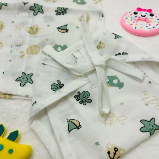 Pure Muslin Button Jabla & Padded Langot | 0-6 Months | Matching Set | Knot Padded Langot & Button Jabla | Starfish & Boats|Unisex