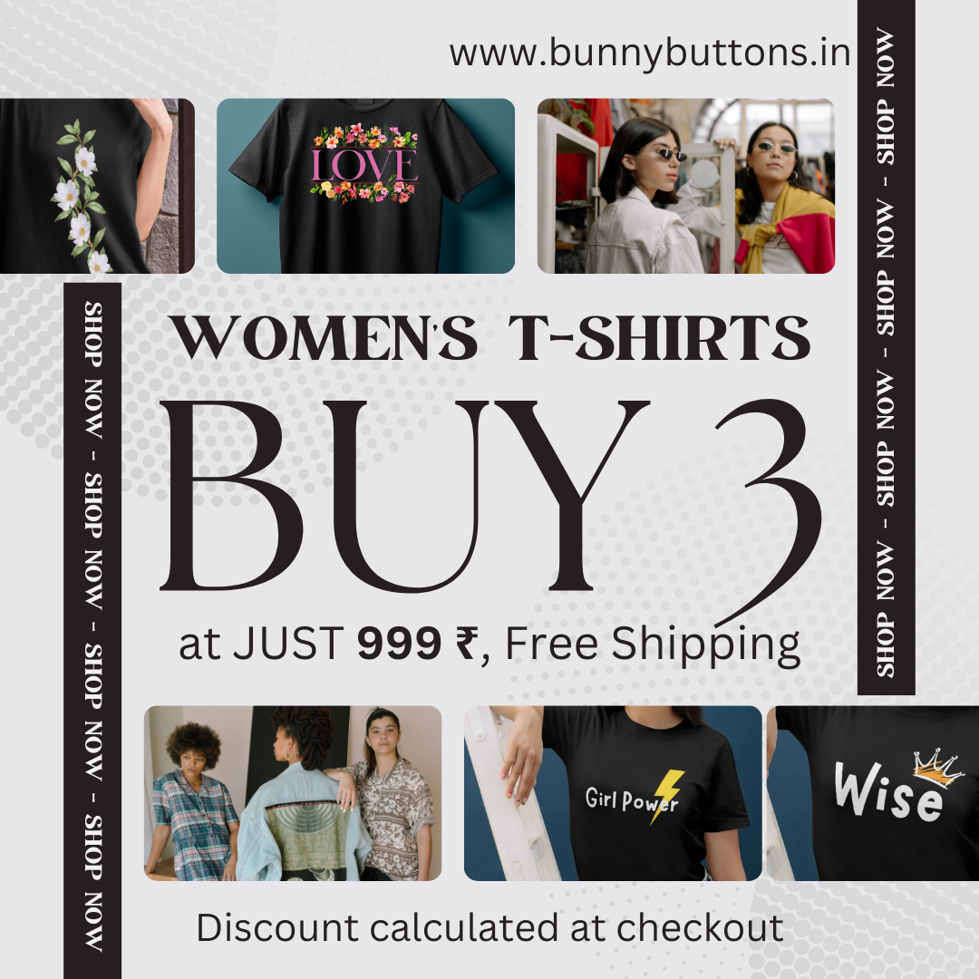 Add Three Women's T-shirts to your cart, buy them at FLAT 999₹ including Free Shipping. Limited period offer, claim now!