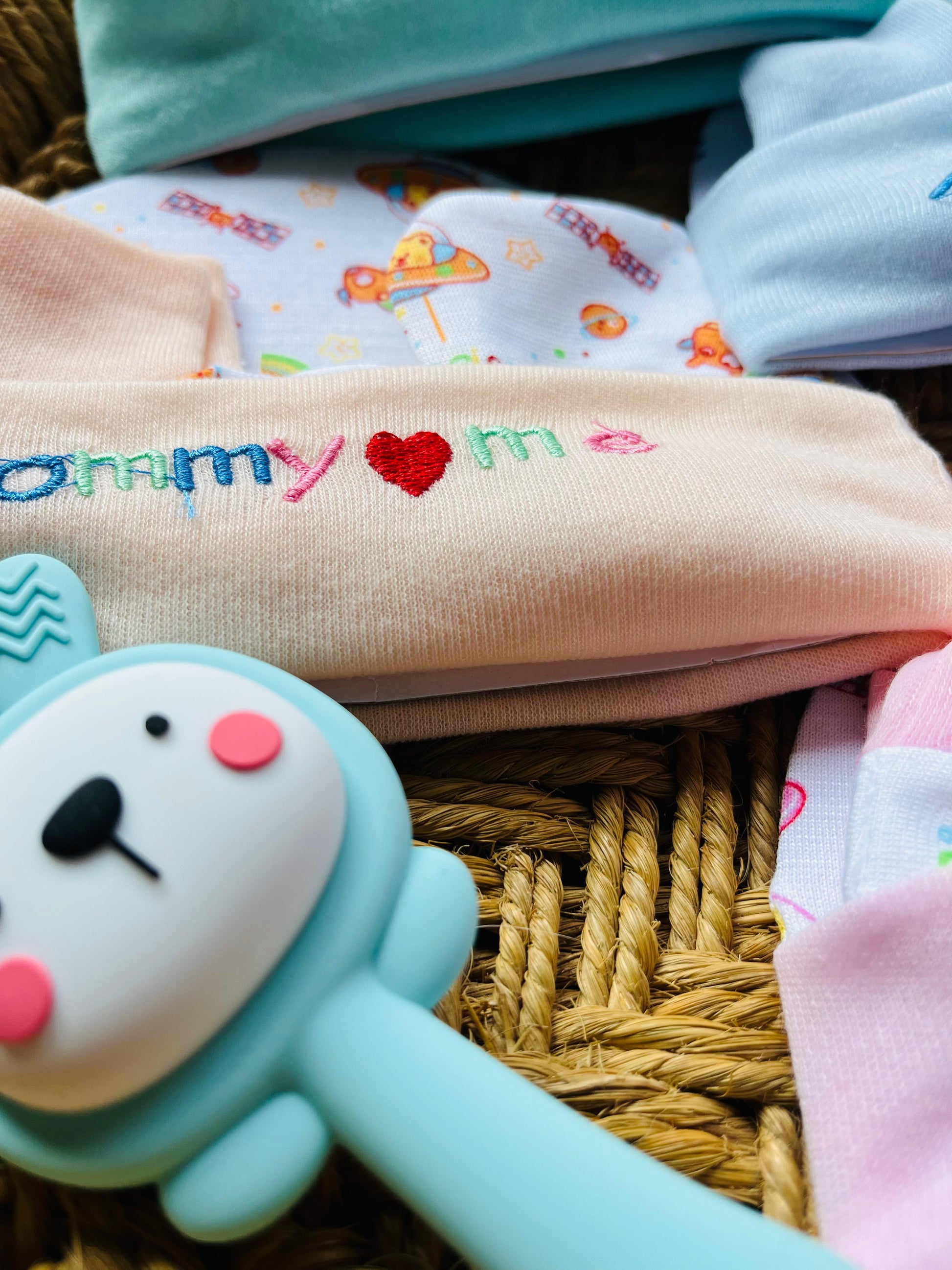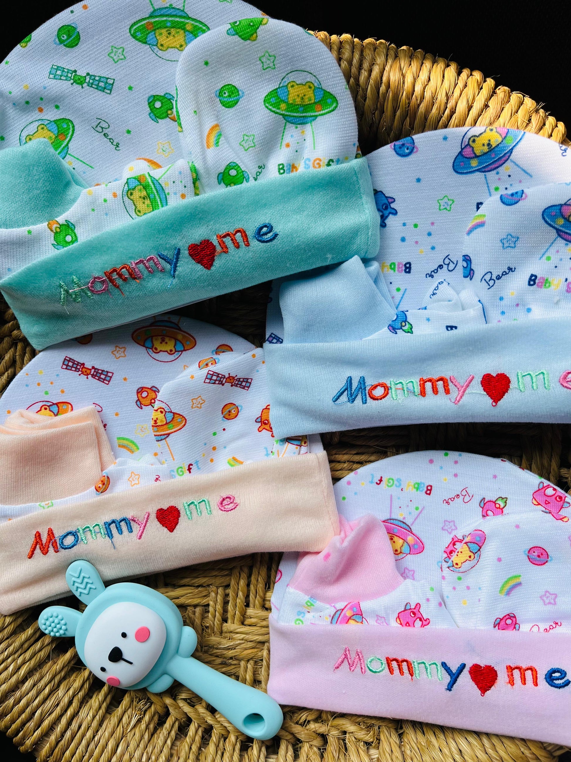 Cap and Mitten | Set of 4 | Pair of Socks, Gloves and Cap ( 0 - 12 Months) Printed Peach, Yellow, Blue and Mint Set